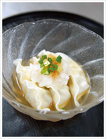 浮いてきた餃子をすくい、氷水にとり、皿に盛ったら、大根おろし・刻みねぎ、そしてポン酢を少々かけて召し上がる。